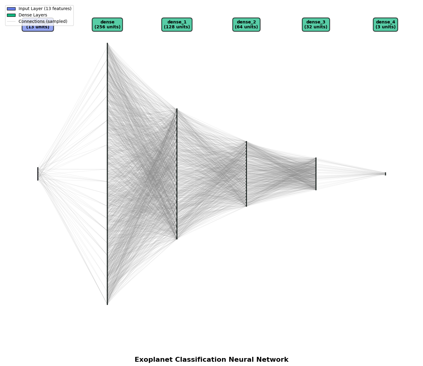 October 5-7, 2025We developed a neural network model for exoplanet classification system that automatically analyzes NASA TESS mission data to identify and categorize celestial objects as Confirmed Planets (CP), Planet Candidates (PC), or False Positives (FP). Our system addresses the challenge of processing the massive backlog of TESS observations that would take astronomers days to review manually.