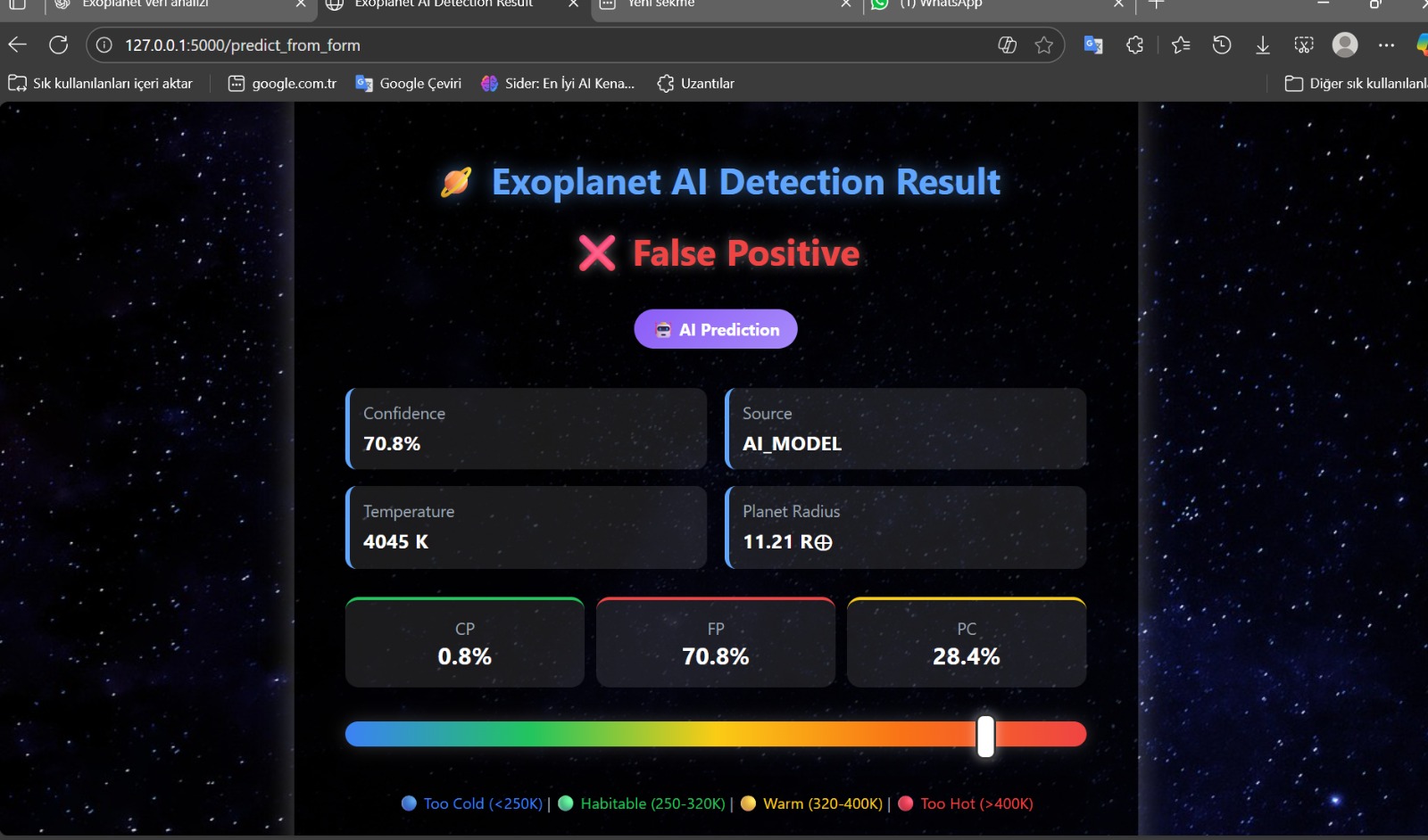 Using a deep neural network trained on over 5,000 observations with 13 key astrophysical parameters, we achieve an accuracy of 78% or higher in classification. The system features a two-tier approach: first checking NASA's database using fuzzy matching (2% error margin) for known planets, then deploying our AI model for new discoveries. Users interact through an intuitive web interface where they can input individual observations or upload batch CSV files, receiving instant predictions with confidence scores, temperature analysis, and habitability assessments.